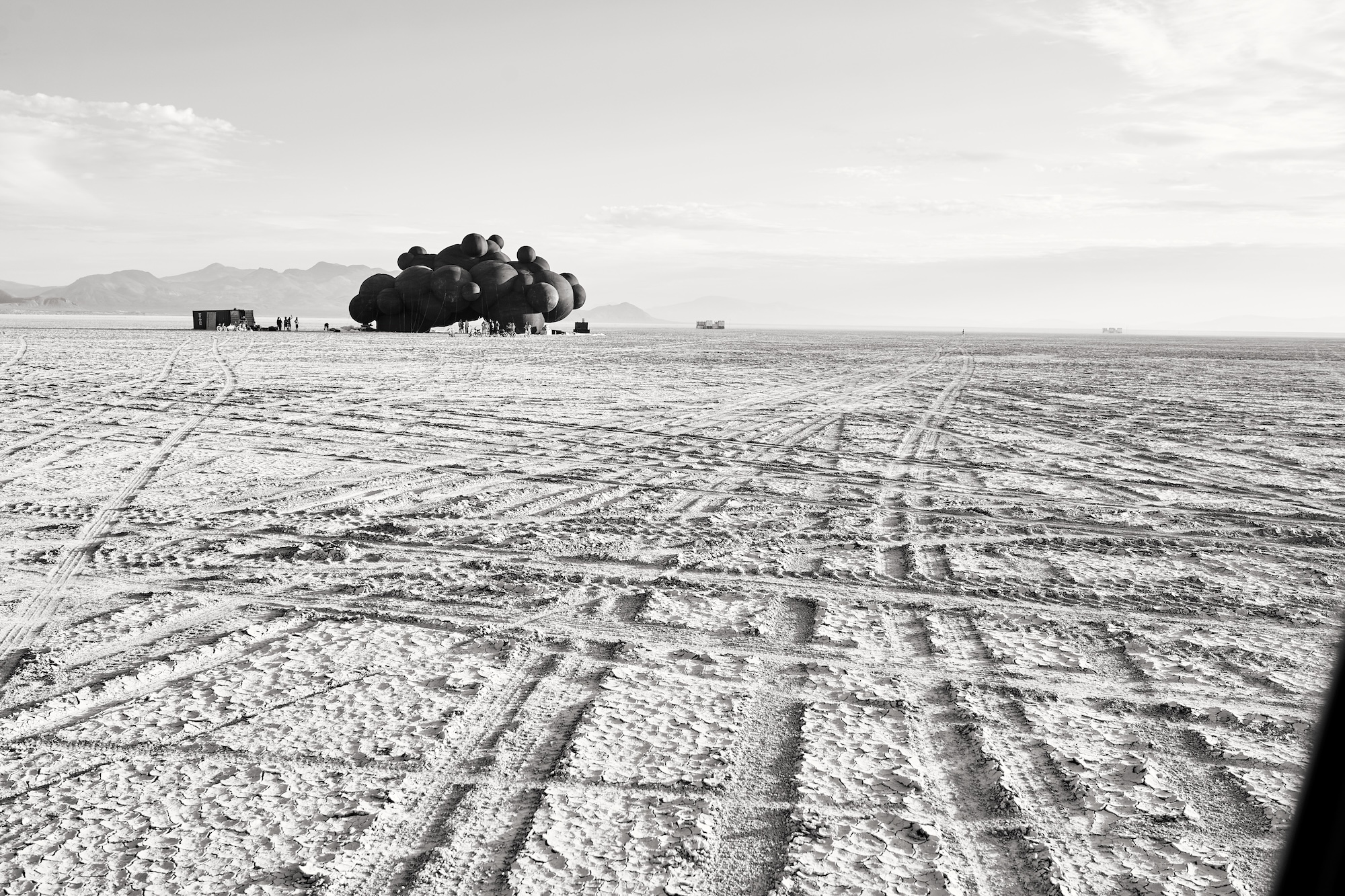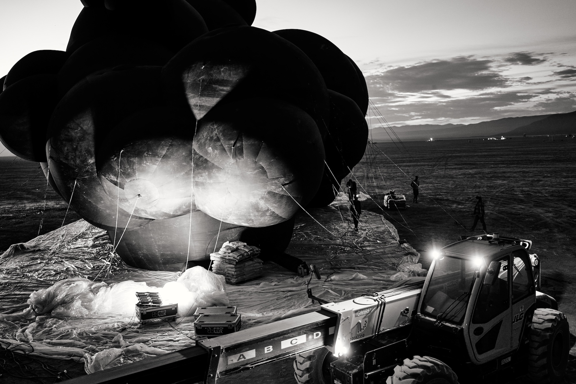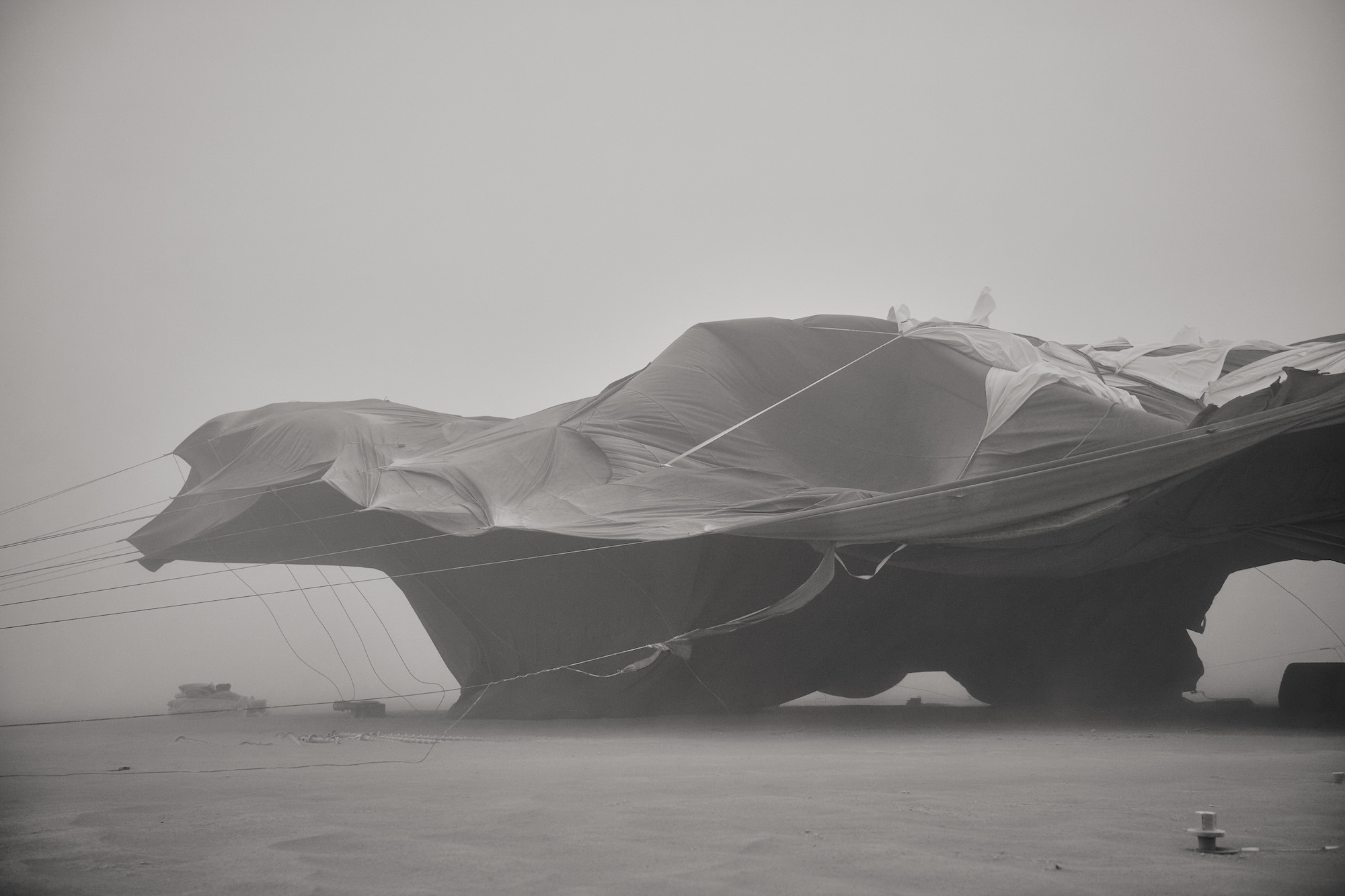 In the Black Rock Desert, amid the dry winds and endless horizons of Nevada, a Ukrainian Black Cloud took root. It knew nothing of the sky, it was born of fear and war. A shadow fallen upon the earth, it stood 50 feet tall, 100 feet long, and 55 feet wide, weighing seven tons. It resembled a haunting thought that escaped from the mind, consuming a massive stretch of space. Periodically, the cloud flashes with anxious rhythms, the sounds of thunder and lightning, but these are not the sounds of the sky. From its interior come the recordings of war: the explosions and shelling of Zaporizhzhia, pulled from the acoustic diary of musician Denys Vasyliev.