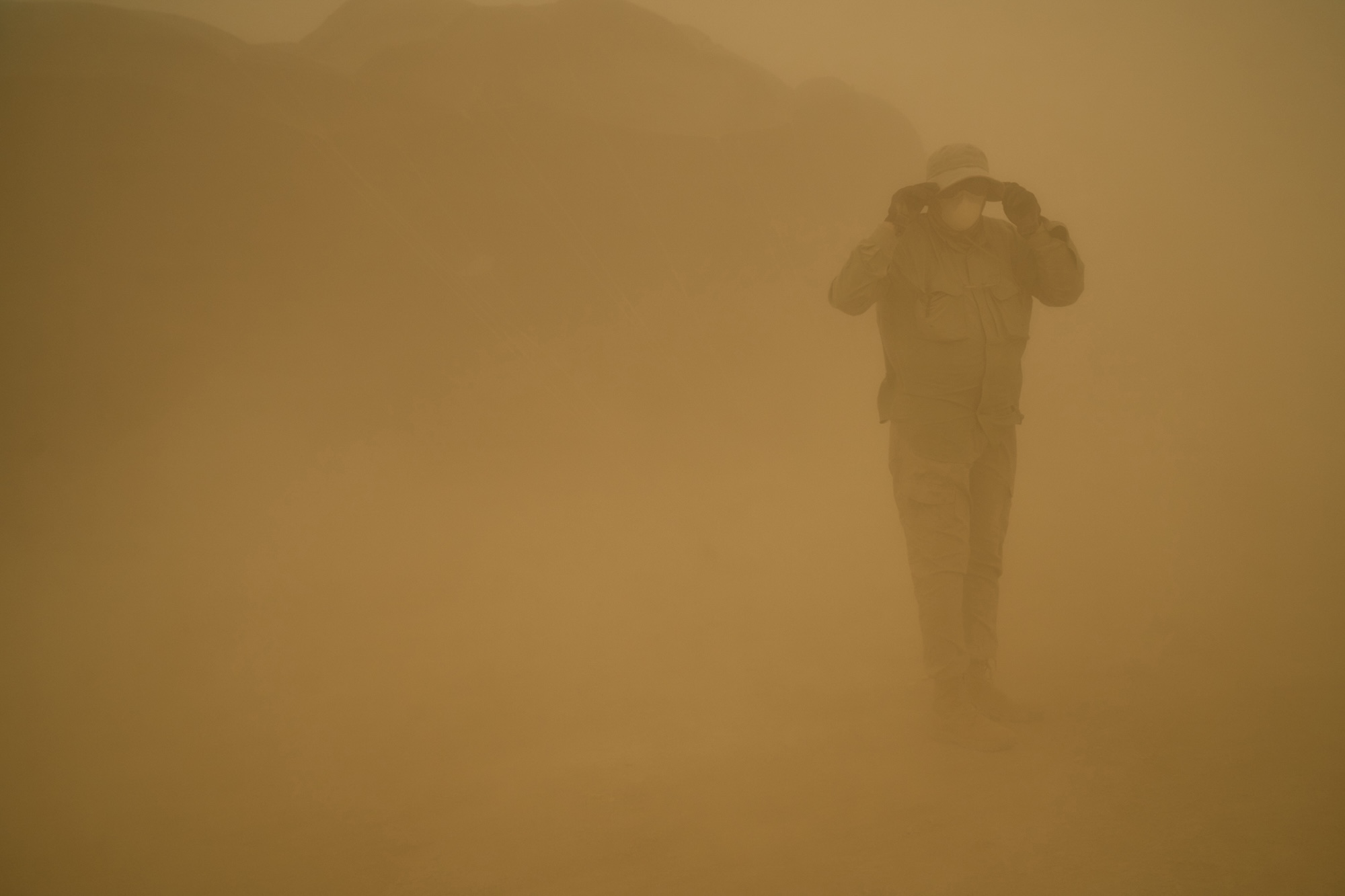 Among his favorite photos is a shot of a man kneeling while tethering the cloud, a gesture that resembles prayer or worship before its majesty. Another powerful work features a “faceless” boy in a black mask and dark glasses, who began posing against the backdrop of the massive cloud.