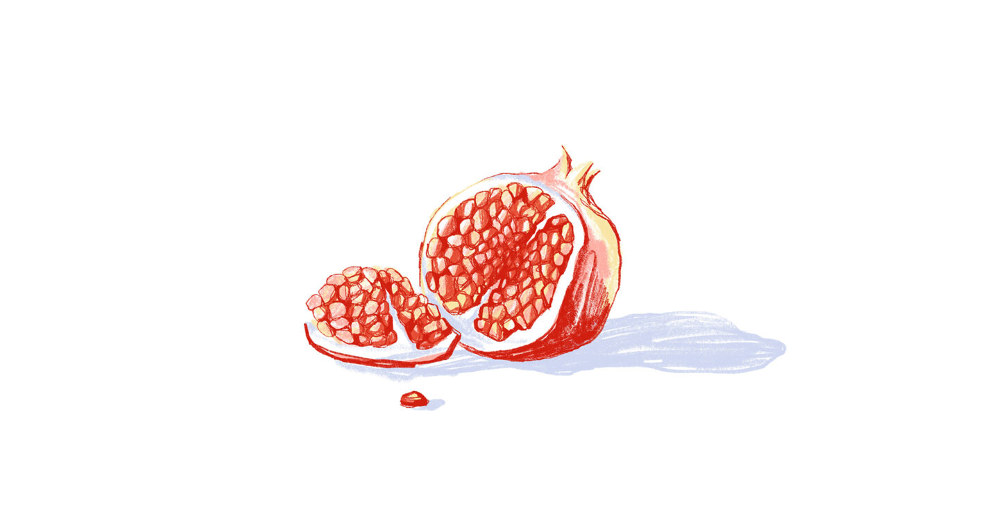 As a treat, my father would buy me pomegranates, a delicacy from the world of warmth and sunshine, packed with nutrients meant to restore my strength. My mother would peel the fruit and arrange the seeds on a pretty plate, making them easy to eat for a child weakened with a fever. I would pick up the little red teardrops one by one, crushing them in my mouth to feel a burst of sweetness followed by a hint of sharpness. A rogue seed would fall on the white sheets now and again and get crushed, leaving a shape that looked like a bloodstain.