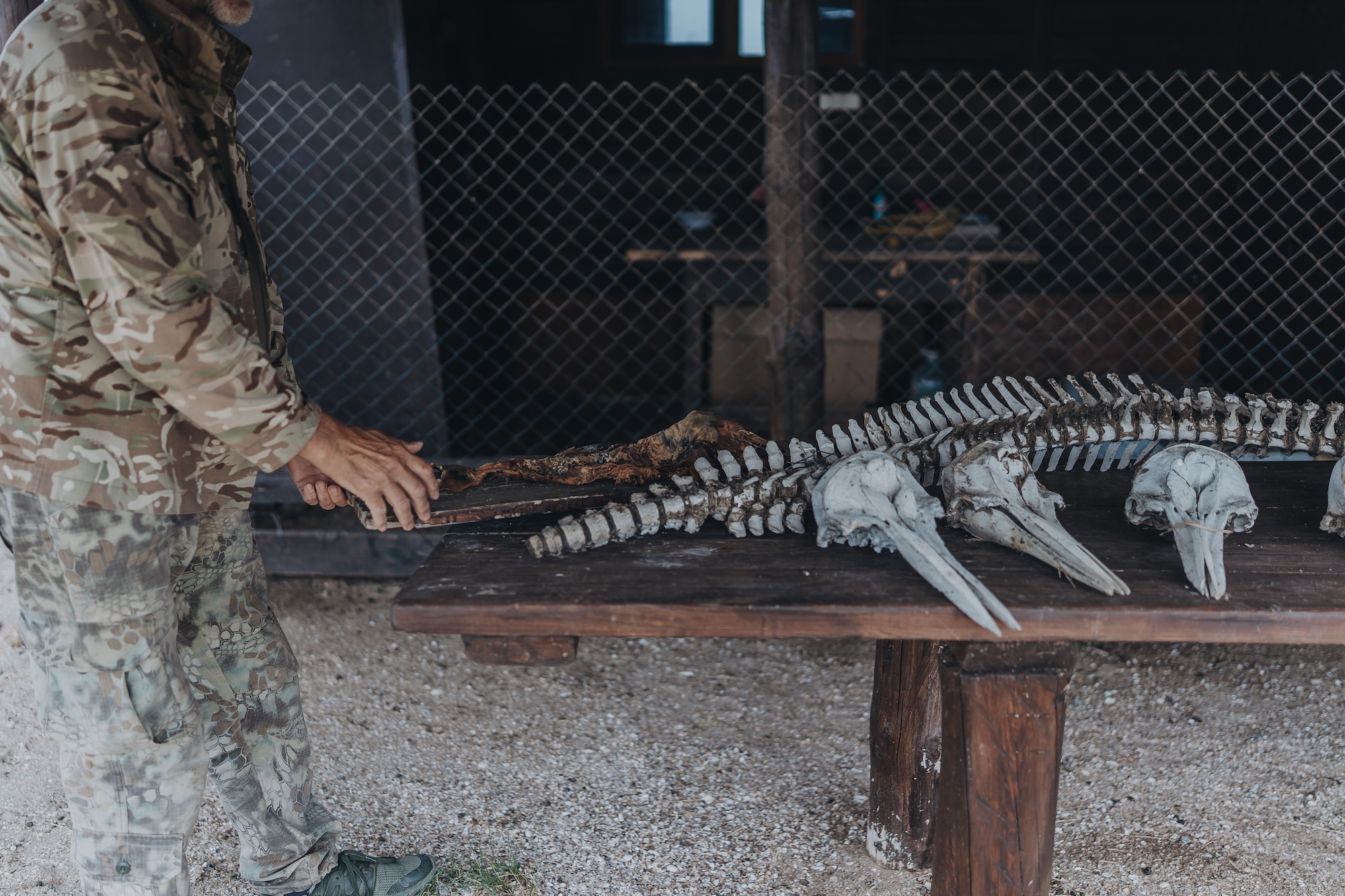 In the backyard of the bungalow near the Shahany Lagoon, they keep the skulls and skeletons of the dolphins that died because of the war.