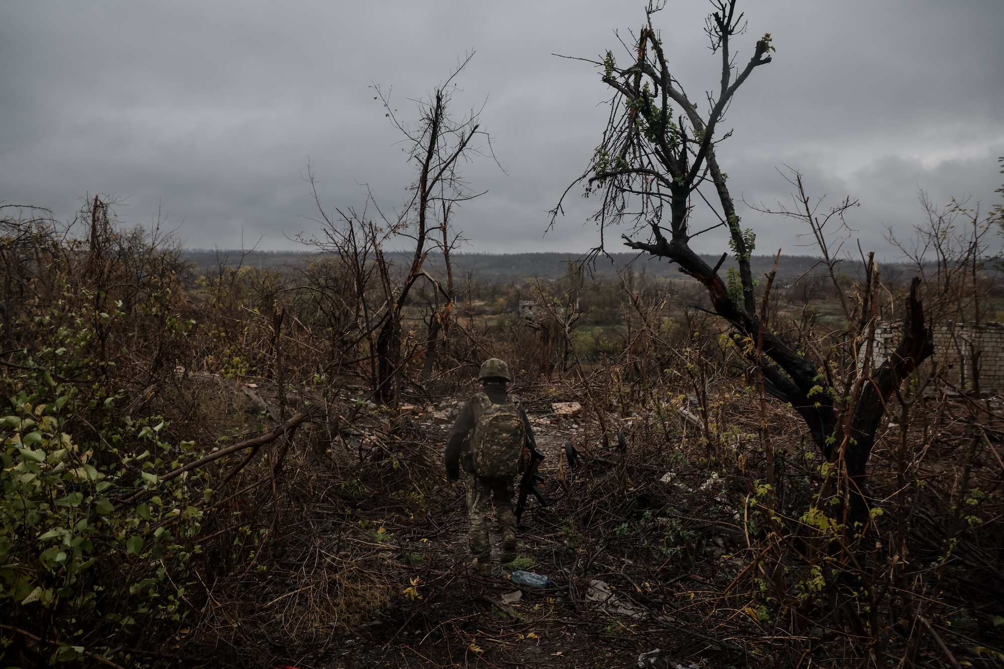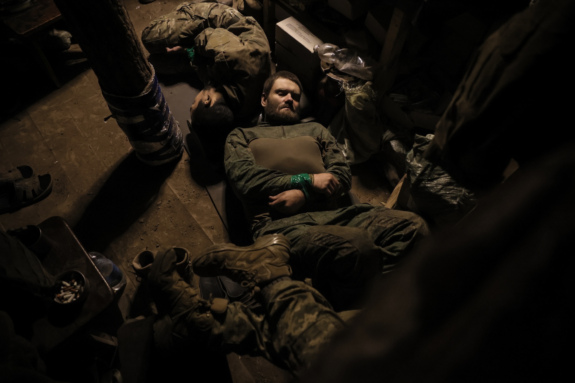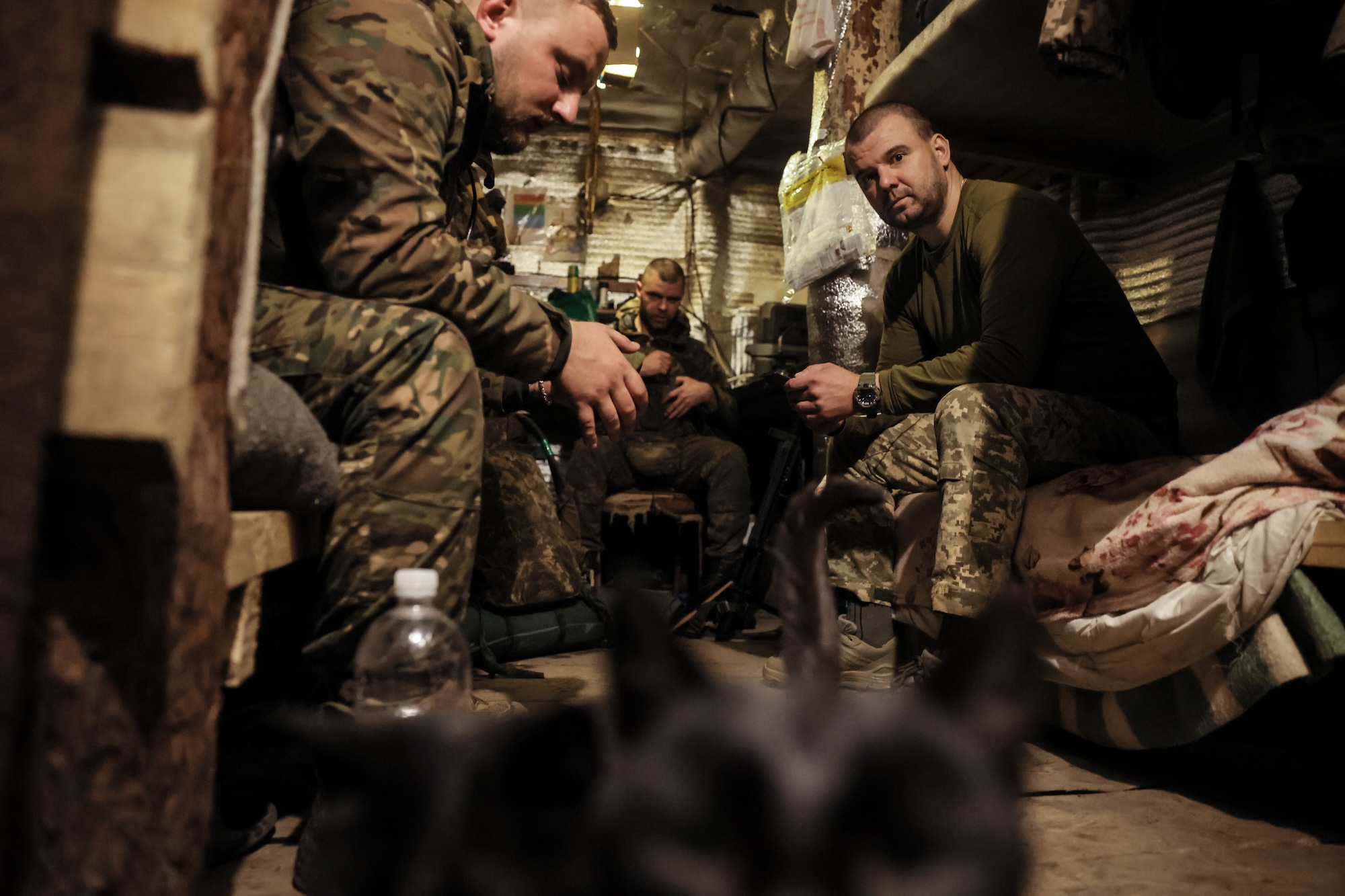 Свічка гріє ноги, освітлює стіни окопу й нагадує, що навіть під землею є місце для життя. Поруч із цим нагорі — кілометри оптоволокна від ворожих дронів і посічена уламками лісосмуга.