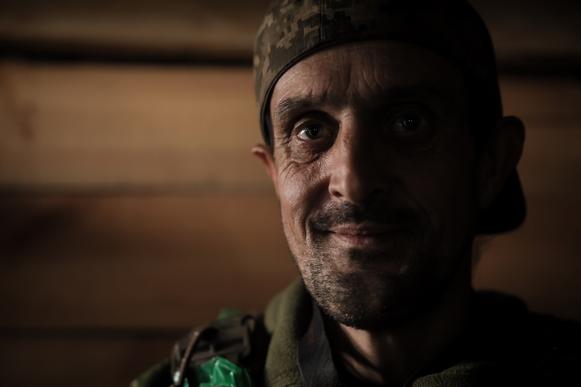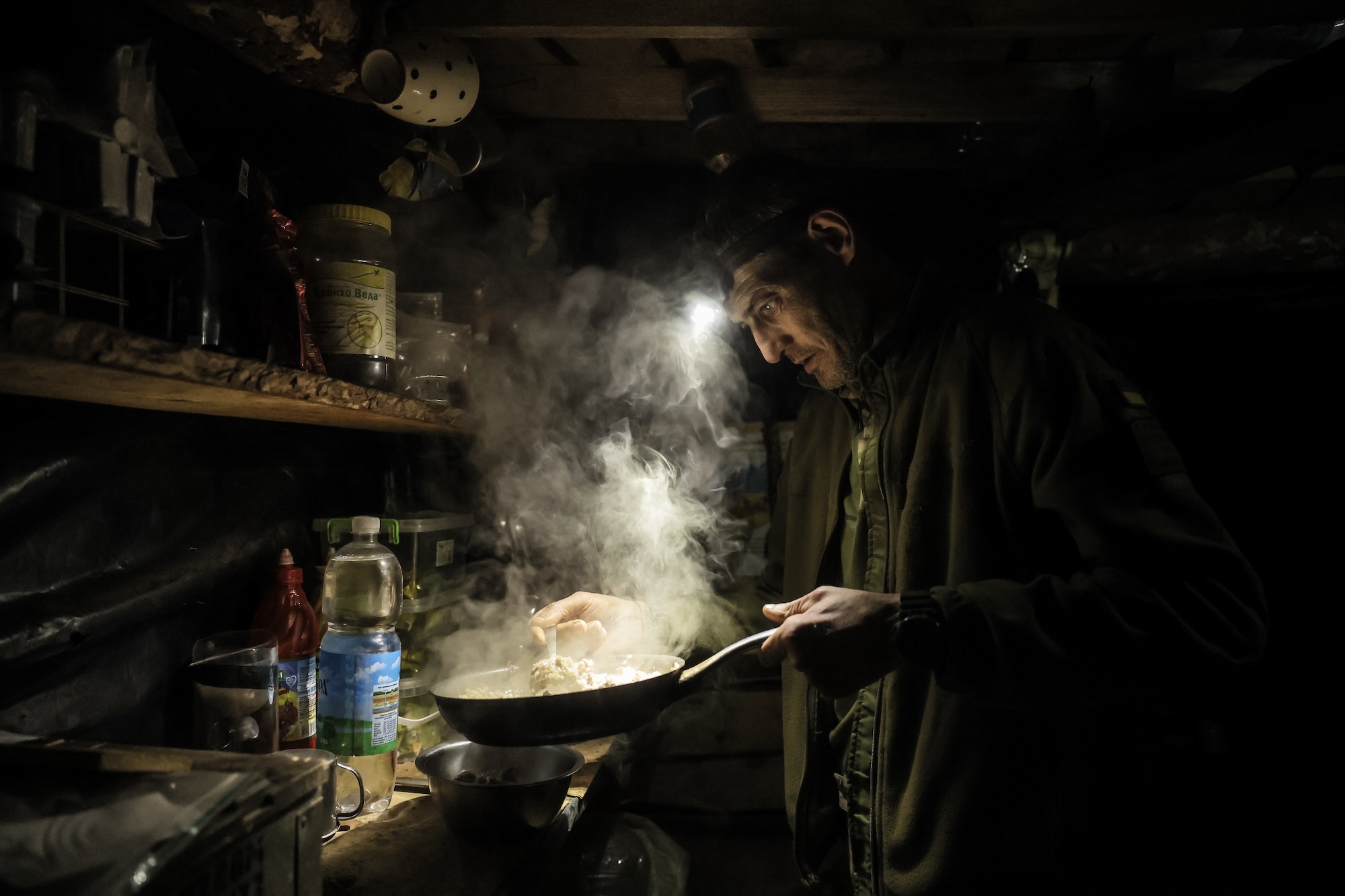 У бліндажі приглушене червоне світло, пахне землею й металом, чутно жарти піхотинців, розмови за цигаркою й горнятком чаю. Їхній побут простий та щирий: пара від сковорідки, в якій розчиняється втома, зігріті від окопної свічки ноги й муркотіння кота, врятованого з руїн розбитого будинку.